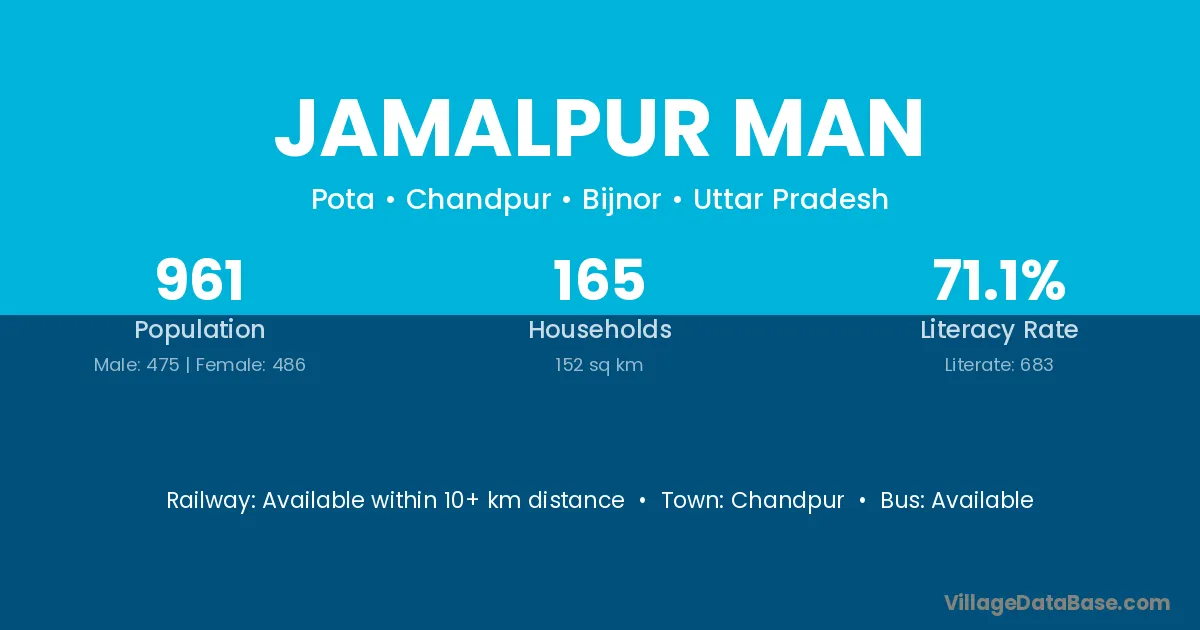 Jamalpur Man village has a total population of 961 people, of which 475 are males and 486 are females.