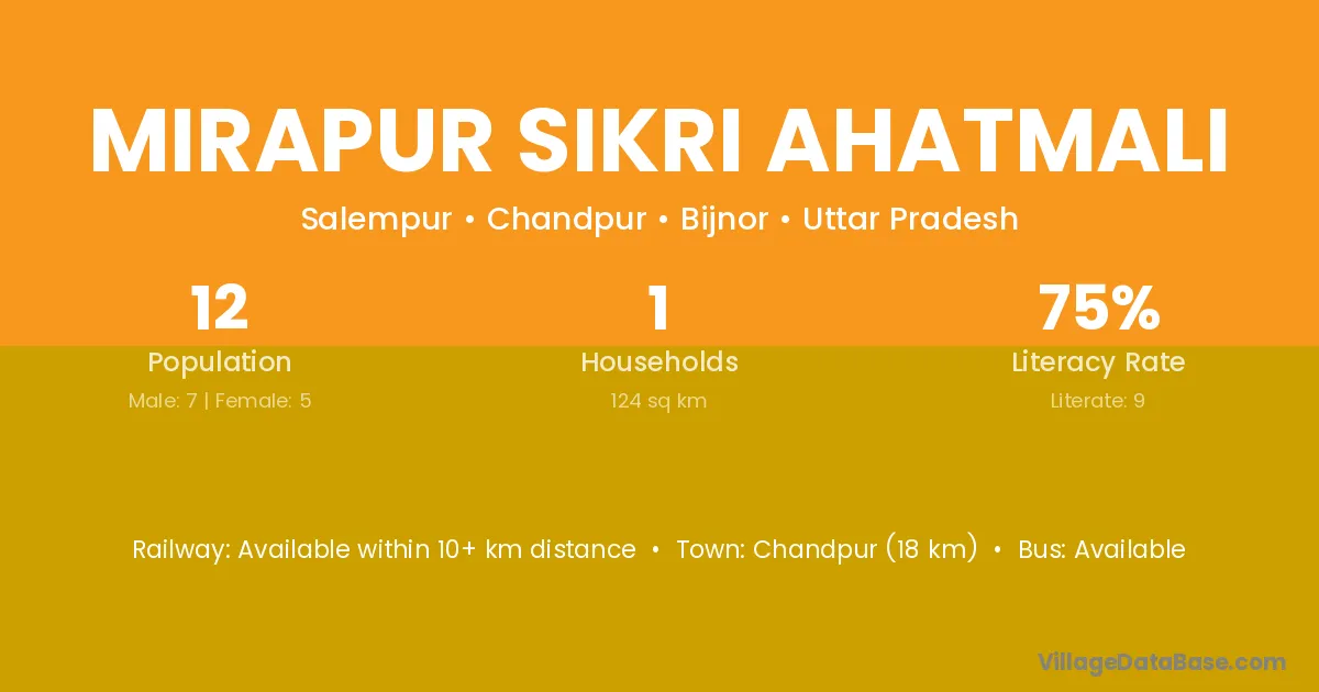 Mirapur Sikri Ahatmali village has a total population of 12 people, of which 7 are males and 5 are females.