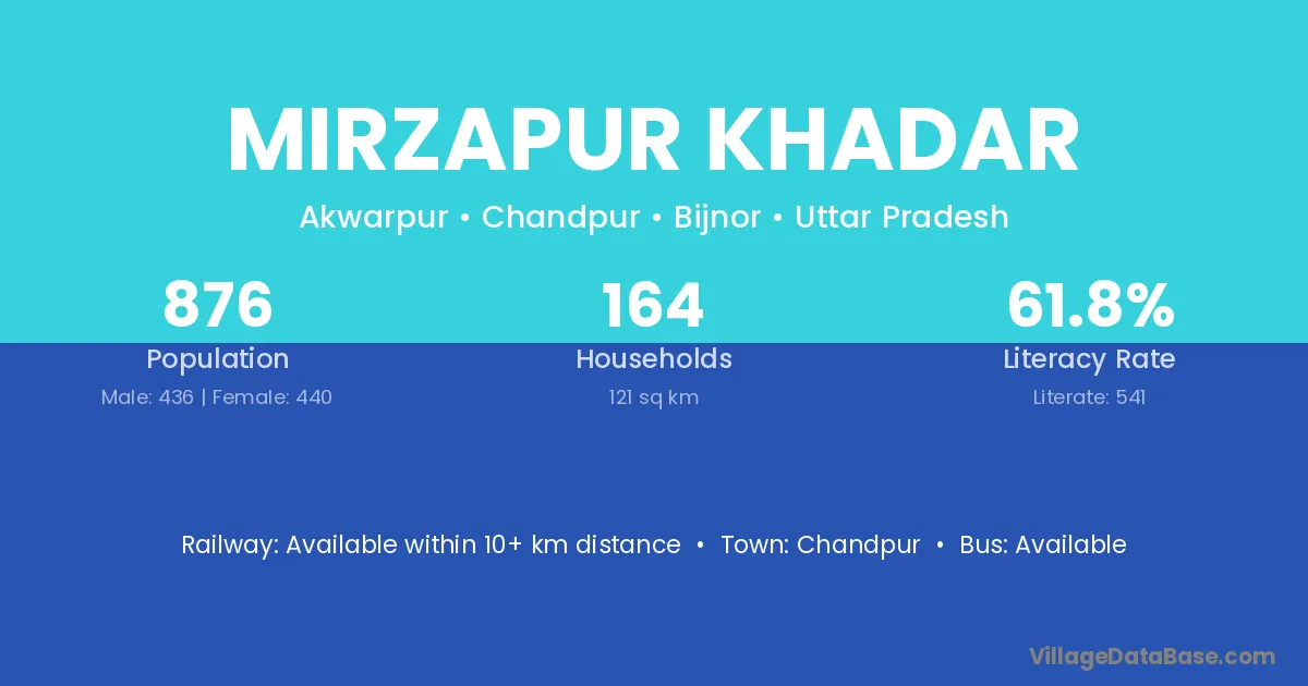 Mirzapur Khadar village has a total population of 876 people, of which 436 are males and 440 are females.