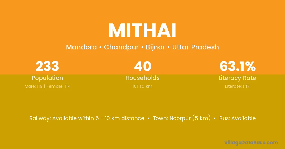 Noorpur (5 km) is the nearest town to Mithai village for major economic activities and is located approximately 5 km away.