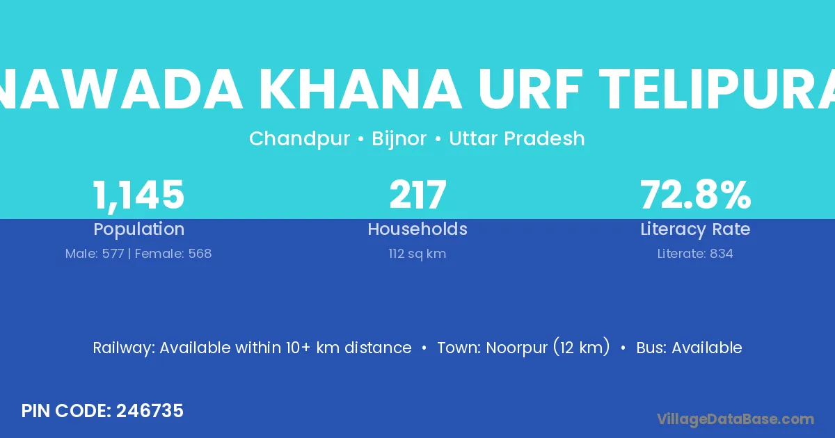 Nawada Khana Urf Telipura village has a total population of 1,145 people, of which 577 are males and 568 are females.