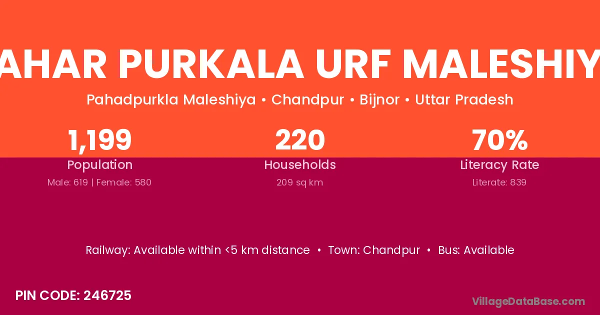Pahar Purkala Urf Maleshiya village has a total population of 1,199 people, of which 619 are males and 580 are females.