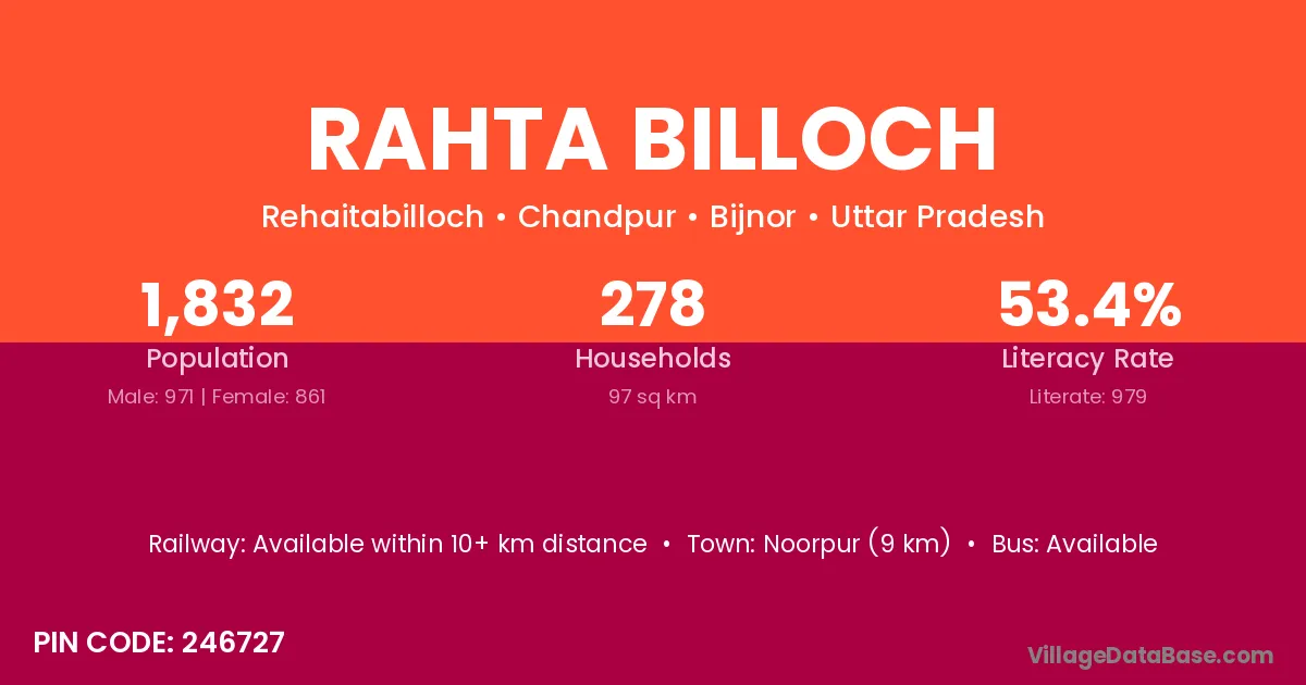 Rahta Billoch village has a total population of 1,832 people, of which 971 are males and 861 are females.