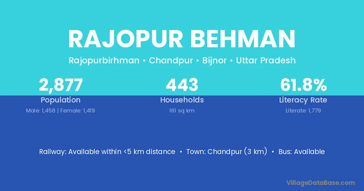 Chandpur (3 km) is the nearest town to Rajopur Behman village for major economic activities and is located approximately 3 km away.