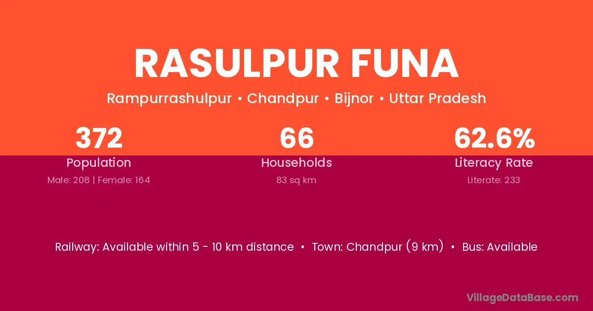 Rasulpur Funa village has a total population of 372 people, of which 208 are males and 164 are females.