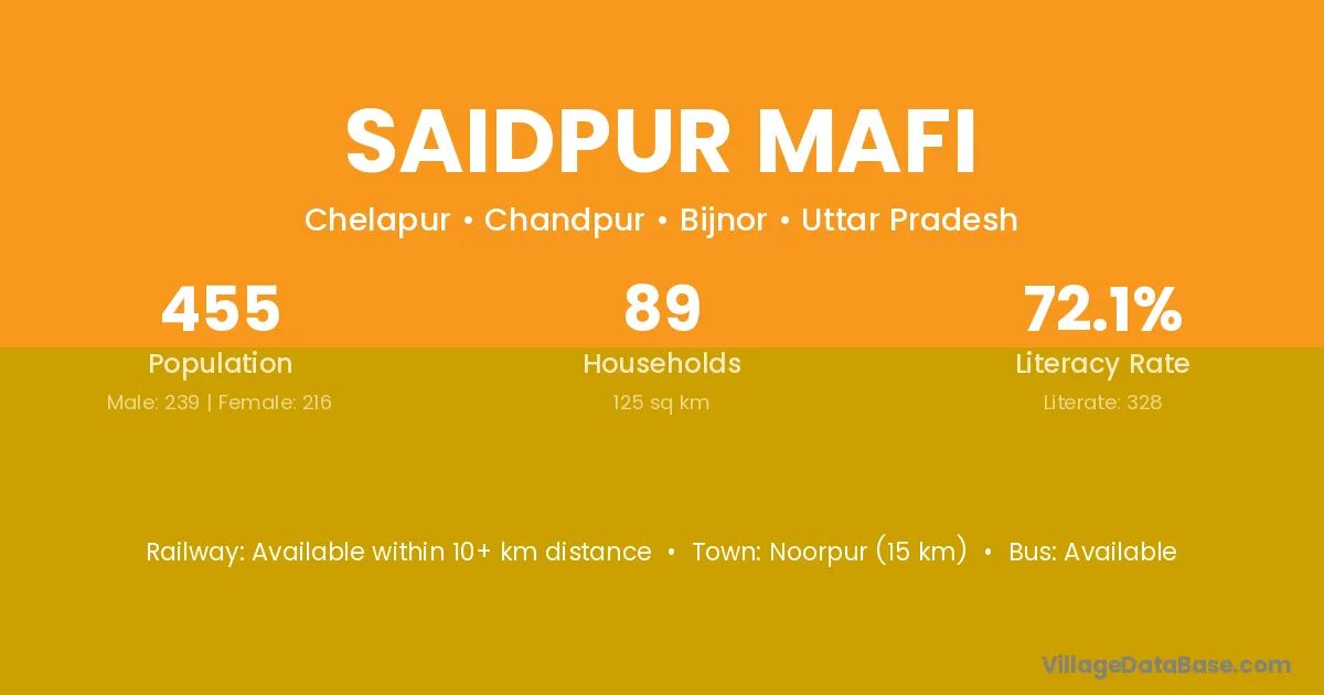 Saidpur Mafi village has a total population of 455 people, of which 239 are males and 216 are females.