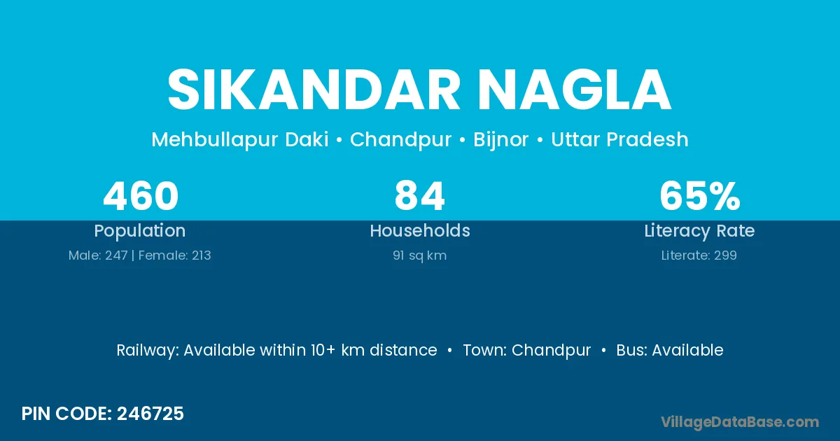 Sikandar Nagla village has a total population of 460 people, of which 247 are males and 213 are females.