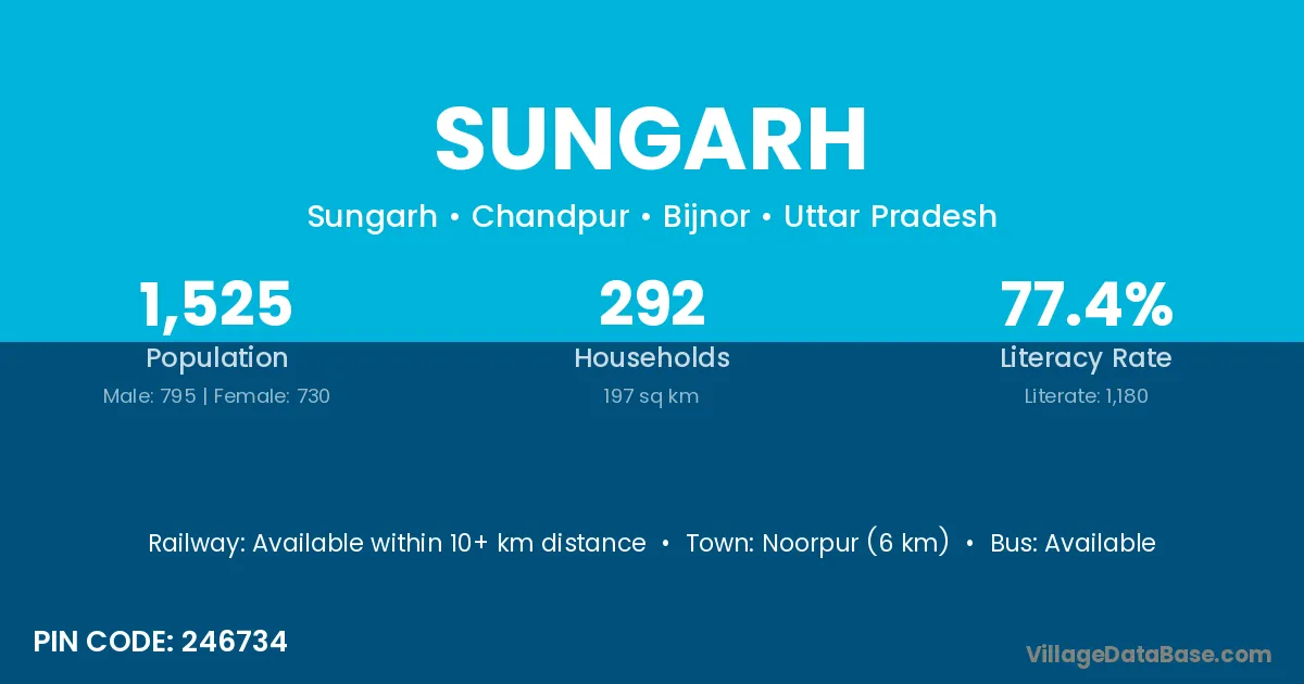 Noorpur (6 km) is the nearest town to Sungarh village for major economic activities and is located approximately 6 km away.