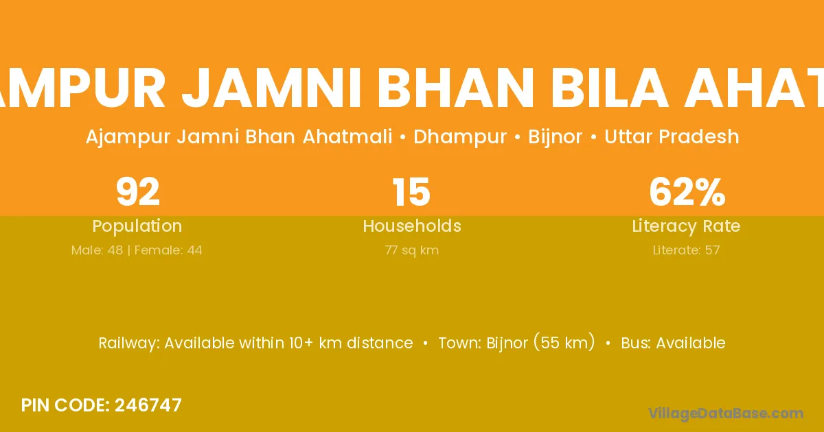 Bijnor (55 km) is the nearest town to Ajampur Jamni Bhan Bila Ahatma village for major economic activities and is located approximately 55 km away.