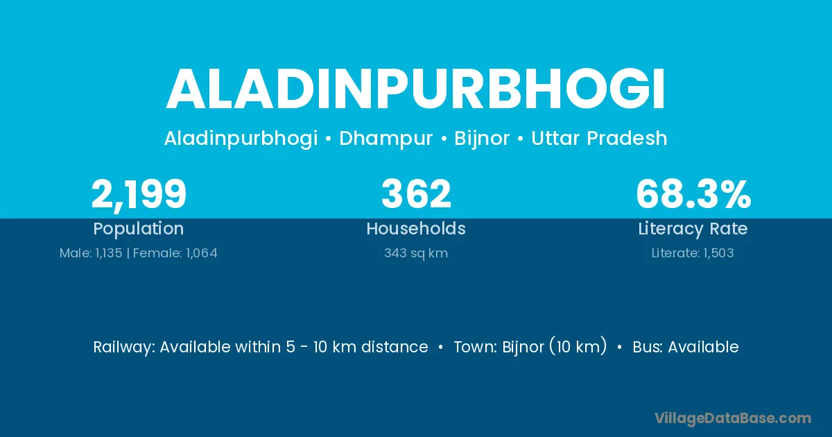 Bijnor (10 km) is the nearest town to Aladinpurbhogi village for major economic activities and is located approximately 10 km away.