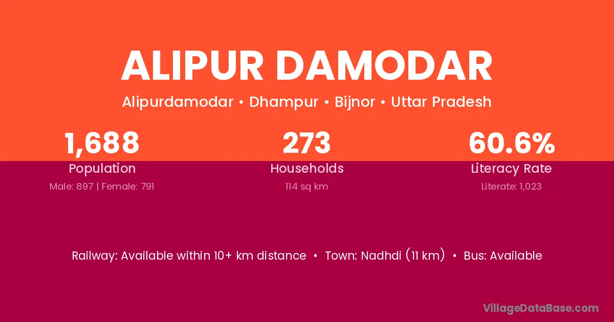 Nadhdi (11 km) is the nearest town to Alipur Damodar village for major economic activities and is located approximately 11 km away.