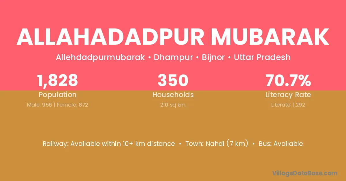 Nahdi (7 km) is the nearest town to Allahadadpur Mubarak village for major economic activities and is located approximately 7 km away.