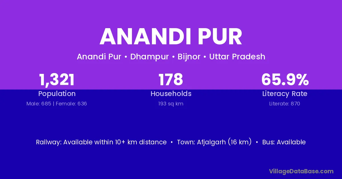 Afjalgarh (16 km) is the nearest town to Anandi Pur village for major economic activities and is located approximately 16 km away.