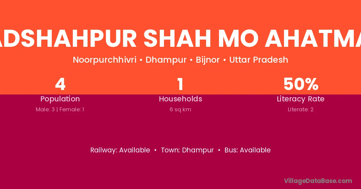 Badshahpur Shah Mo Ahatmali village has a total population of 4 people, of which 3 are males and 1 are females.