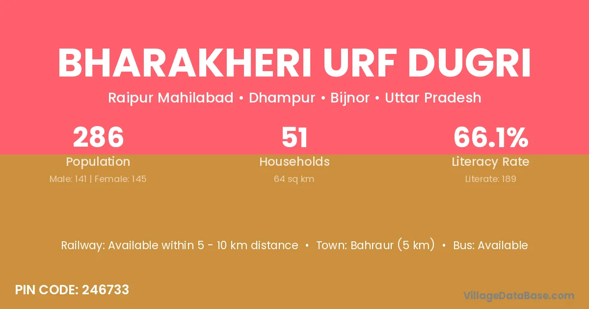 Bharakheri Urf Dugri village has a total population of 286 people, of which 141 are males and 145 are females.