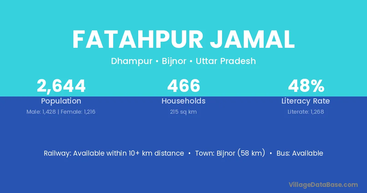 Bijnor (58 km) is the nearest town to Fatahpur Jamal village for major economic activities and is located approximately 58 km away.