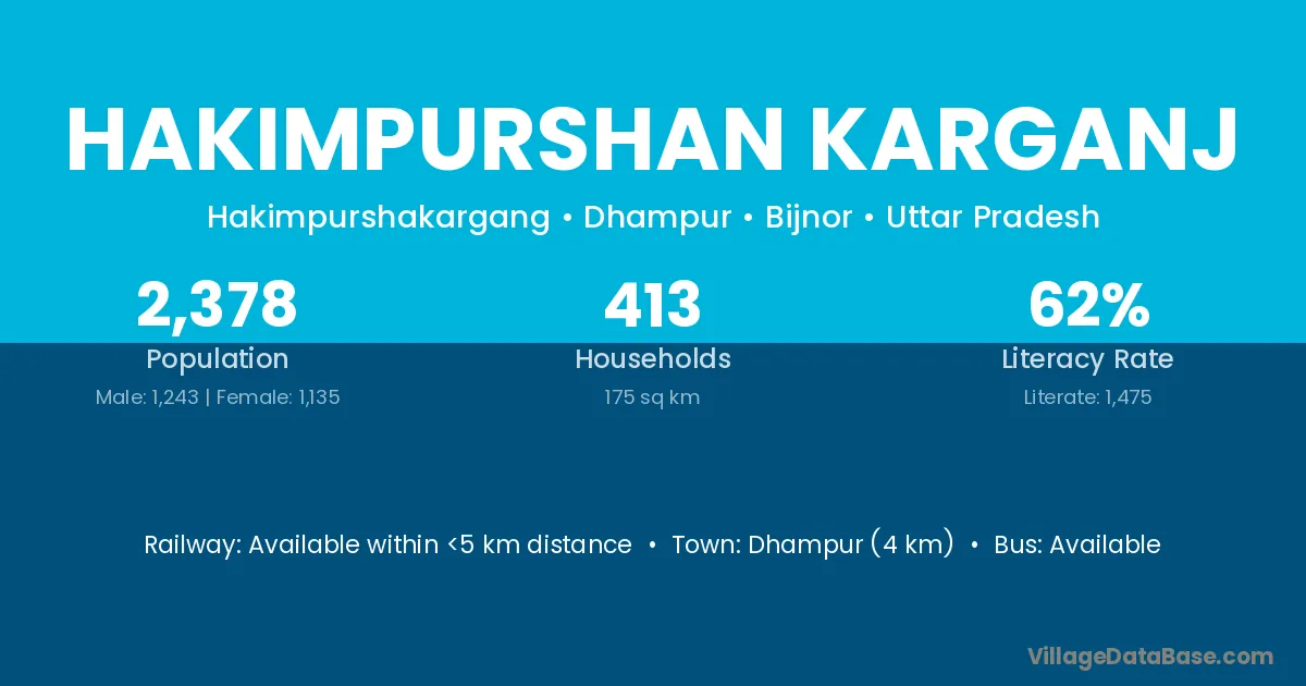 Dhampur (4 km) is the nearest town to Hakimpurshan Karganj village for major economic activities and is located approximately 4 km away.