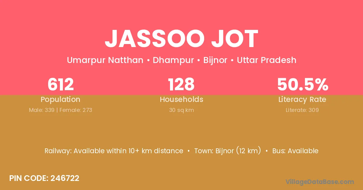 Bijnor (12 km) is the nearest town to Jassoo Jot village for major economic activities and is located approximately 12 km away.