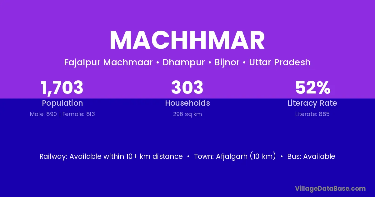 Afjalgarh (10 km) is the nearest town to Machhmar village for major economic activities and is located approximately 10 km away.