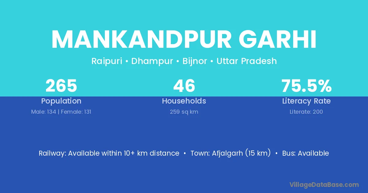 Afjalgarh (15 km) is the nearest town to Mankandpur Garhi village for major economic activities and is located approximately 15 km away.