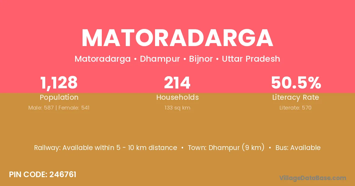 Dhampur (9 km) is the nearest town to Matoradarga village for major economic activities and is located approximately 9 km away.