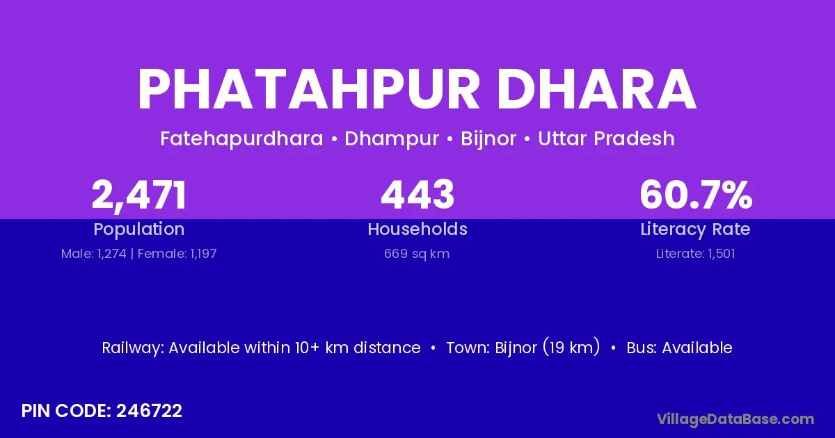 Bijnor (19 km) is the nearest town to Phatahpur Dhara village for major economic activities and is located approximately 19 km away.