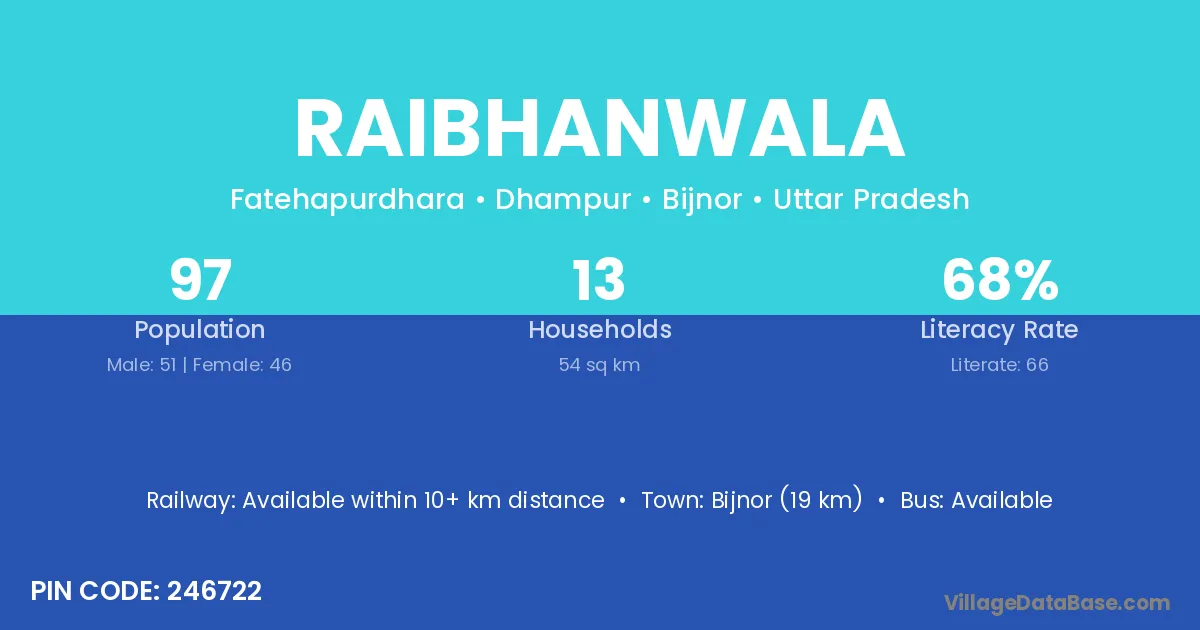 Bijnor (19 km) is the nearest town to Raibhanwala village for major economic activities and is located approximately 19 km away.