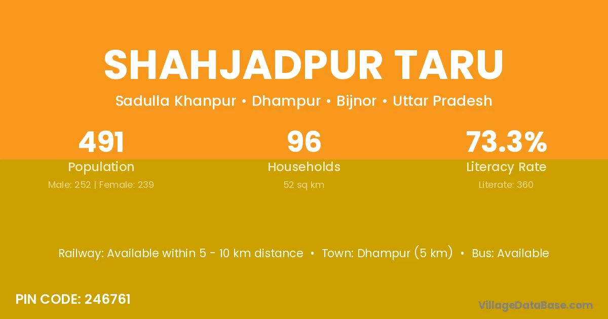Dhampur (5 km) is the nearest town to Shahjadpur Taru village for major economic activities and is located approximately 5 km away.