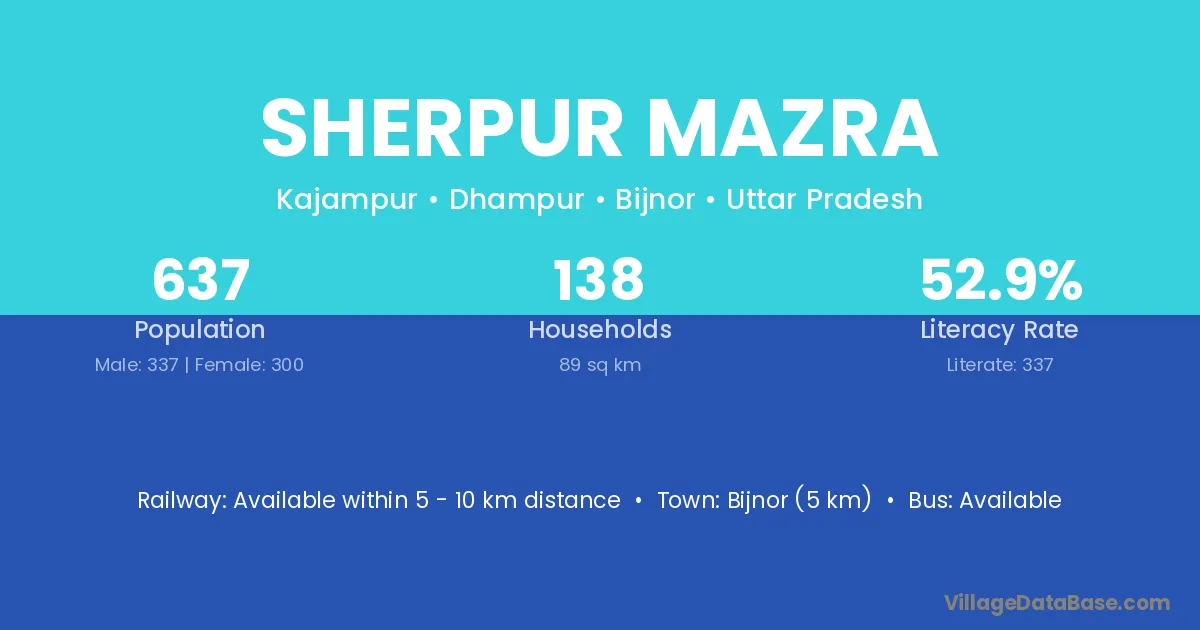 Bijnor (5 km) is the nearest town to Sherpur Mazra village for major economic activities and is located approximately 5 km away.