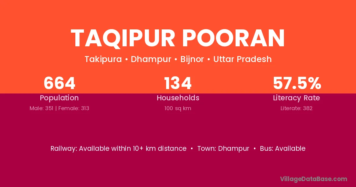 Taqipur Pooran village has a total population of 664 people, of which 351 are males and 313 are females.