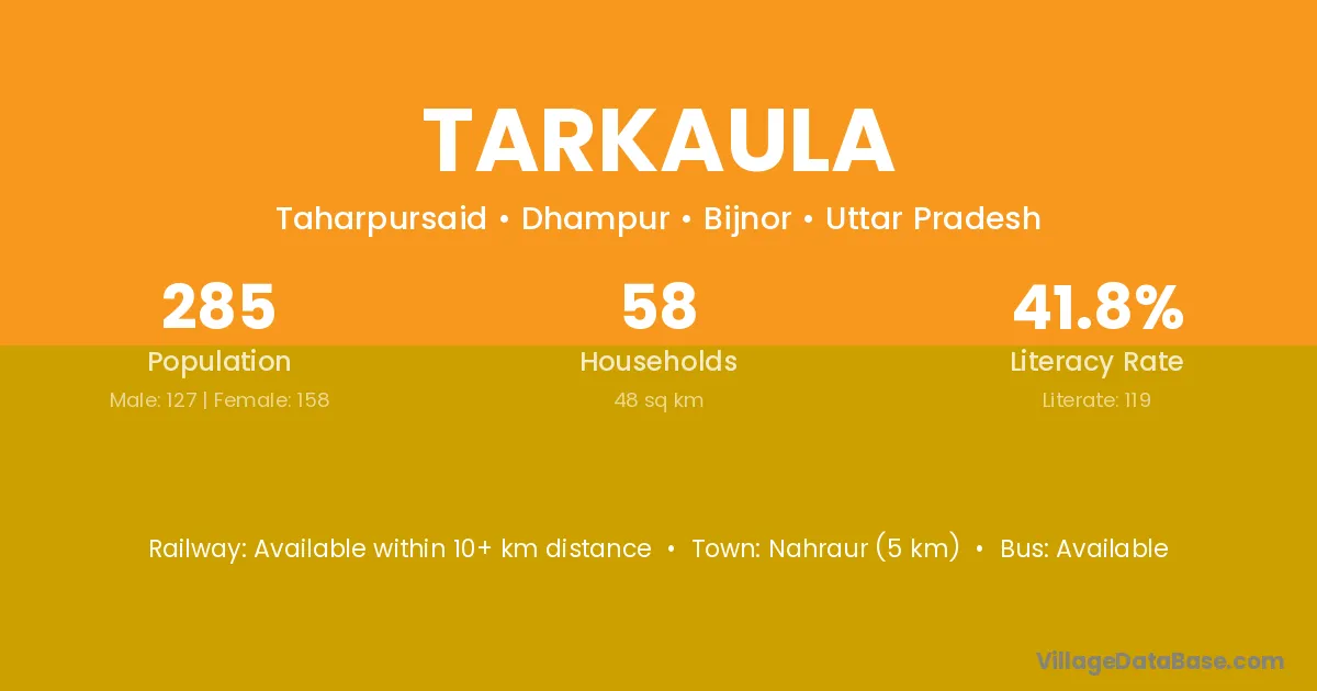Nahraur (5 km) is the nearest town to Tarkaula village for major economic activities and is located approximately 5 km away.