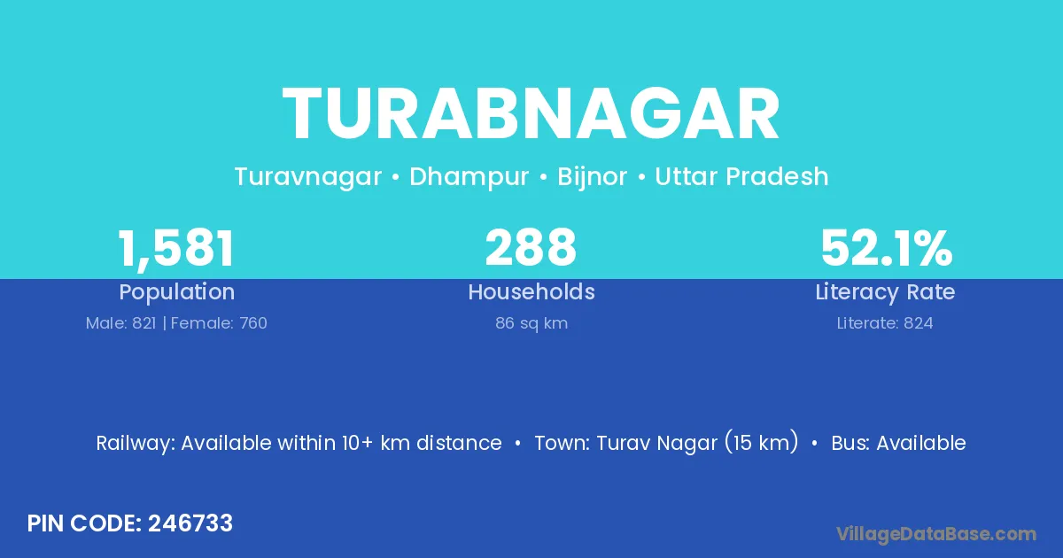 Turav Nagar (15 km) is the nearest town to Turabnagar village for major economic activities and is located approximately 15 km away.