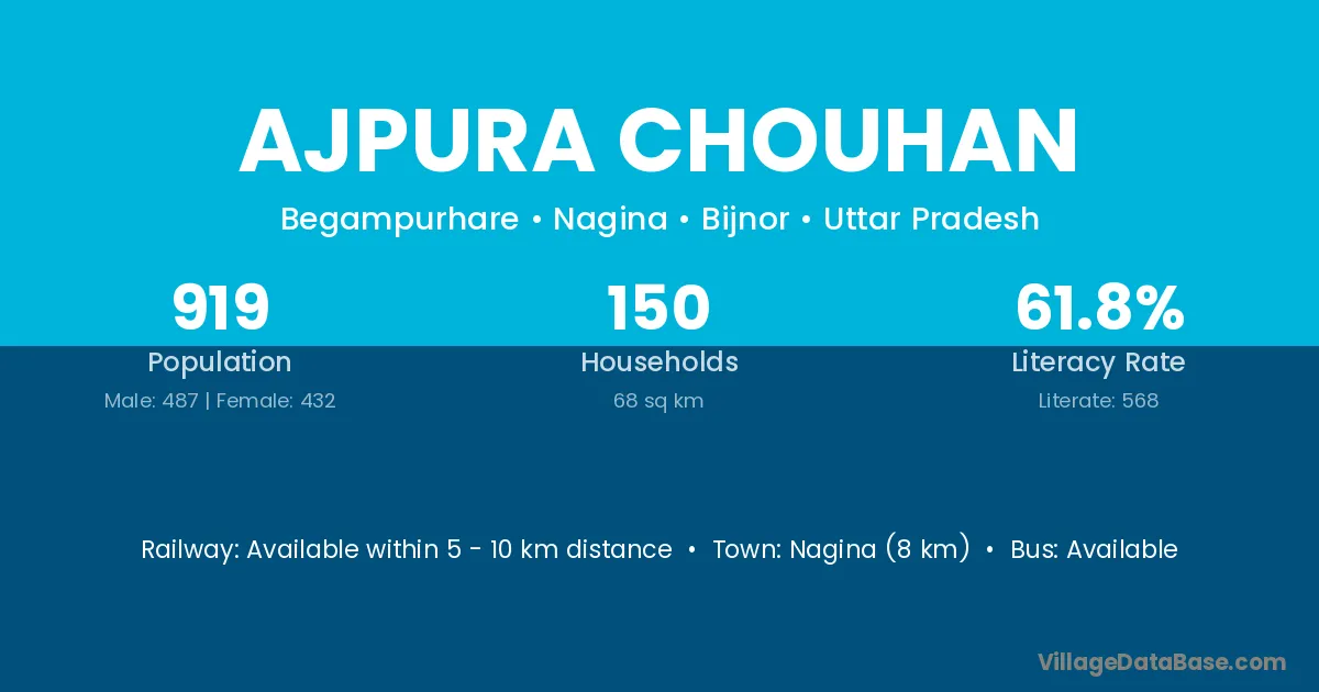 Nagina (8 km) is the nearest town to Ajpura Chouhan village for major economic activities and is located approximately 8 km away.