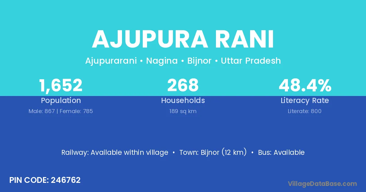 Bijnor (12 km) is the nearest town to Ajupura Rani village for major economic activities and is located approximately 12 km away.