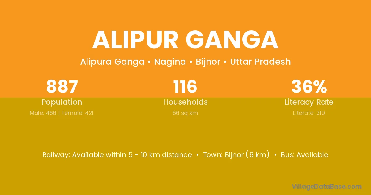 Bijnor (6 km) is the nearest town to Alipur Ganga village for major economic activities and is located approximately 6 km away.