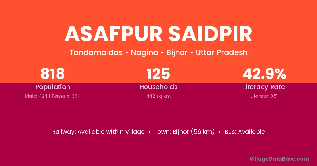 Asafpur Saidpir village has a total population of 818 people, of which 424 are males and 394 are females.