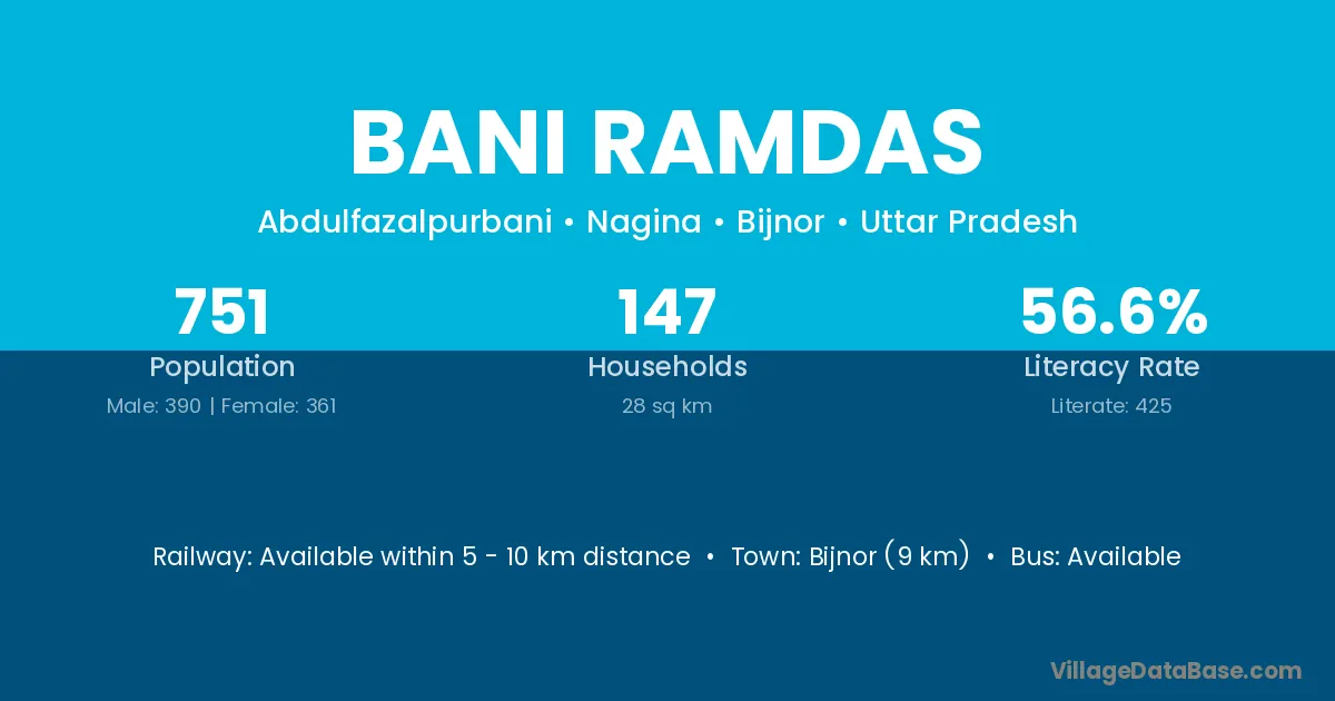 Bijnor (9 km) is the nearest town to Bani Ramdas village for major economic activities and is located approximately 9 km away.