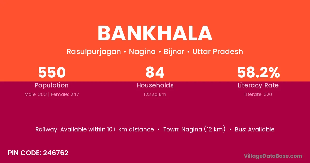 Nagina (12 km) is the nearest town to Bankhala village for major economic activities and is located approximately 12 km away.