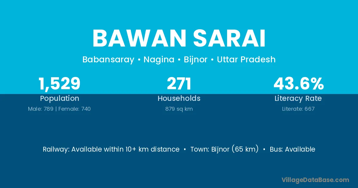 Bijnor (65 km) is the nearest town to Bawan Sarai village for major economic activities and is located approximately 65 km away.