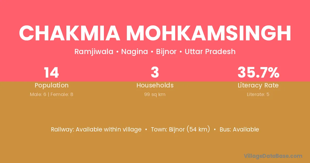 Bijnor (54 km) is the nearest town to Chakmia Mohkamsingh village for major economic activities and is located approximately 54 km away.