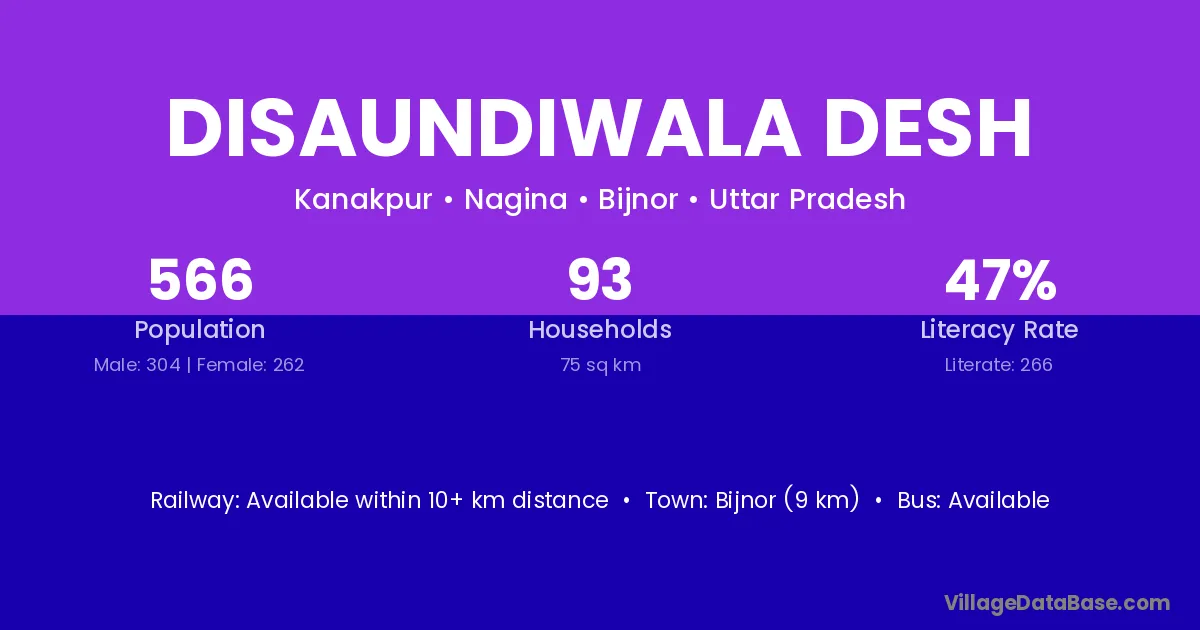 Disaundiwala Desh village has a total population of 566 people, of which 304 are males and 262 are females.