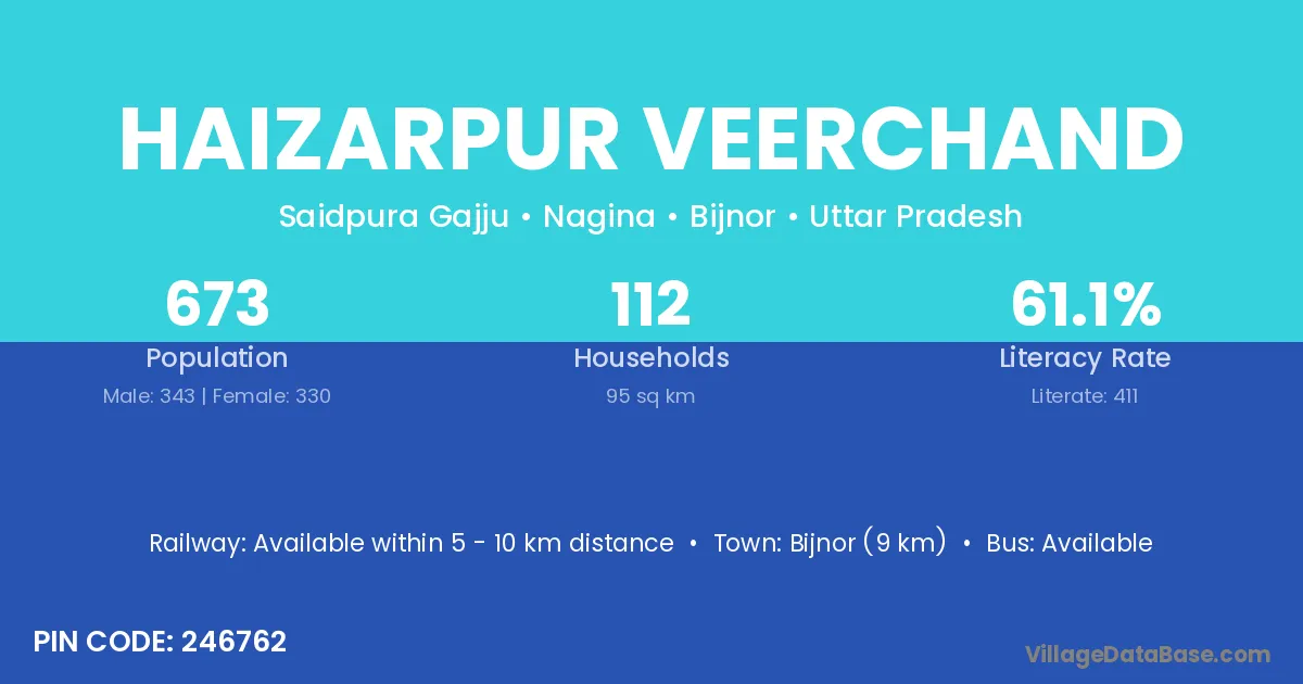 Haizarpur Veerchand village has a total population of 673 people, of which 343 are males and 330 are females.