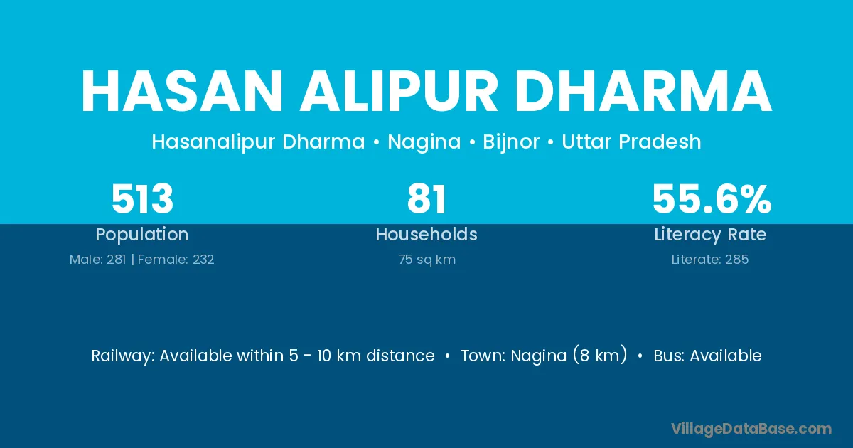 Hasan Alipur Dharma village has a total population of 513 people, of which 281 are males and 232 are females.