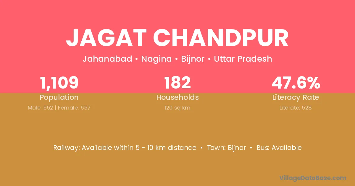 Jagat Chandpur village has a total population of 1,109 people, of which 552 are males and 557 are females.