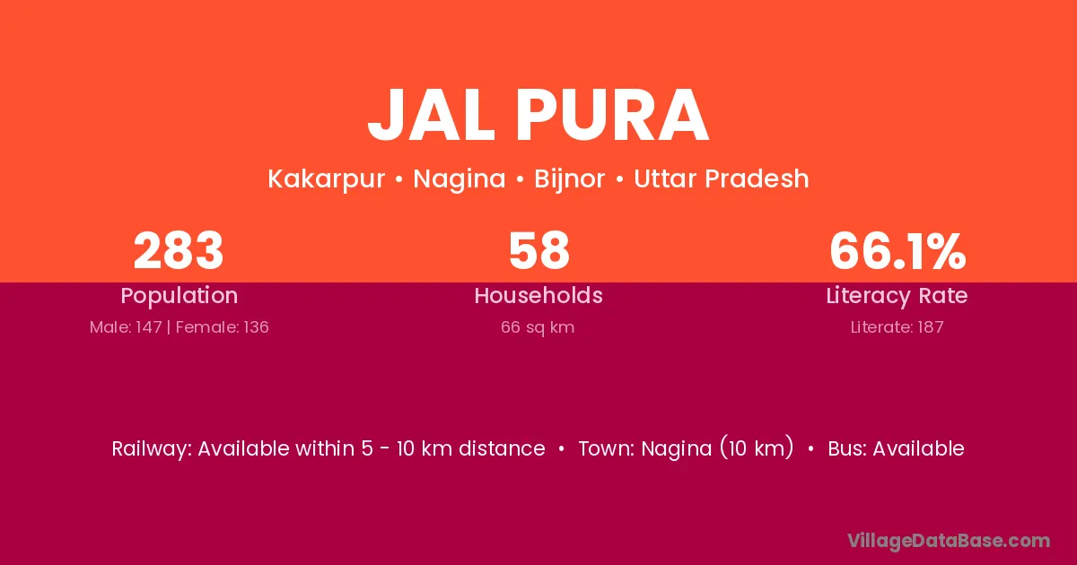Nagina (10 km) is the nearest town to Jal Pura village for major economic activities and is located approximately 10 km away.