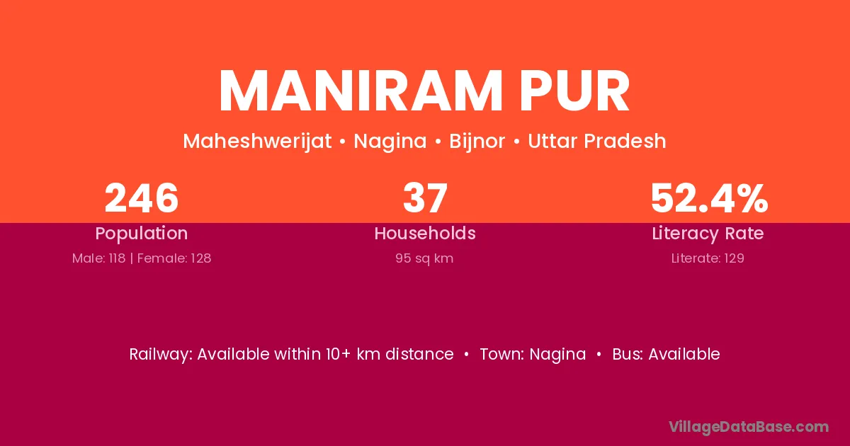 Maniram Pur village has a total population of 246 people, of which 118 are males and 128 are females.