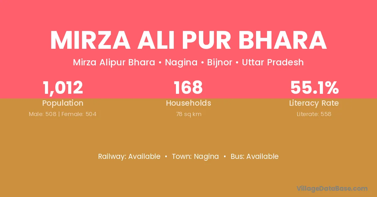 Mirza Ali Pur Bhara village has a total population of 1,012 people, of which 508 are males and 504 are females.