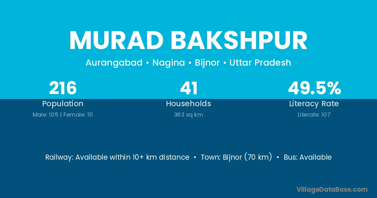Murad Bakshpur village has a total population of 216 people, of which 105 are males and 111 are females.