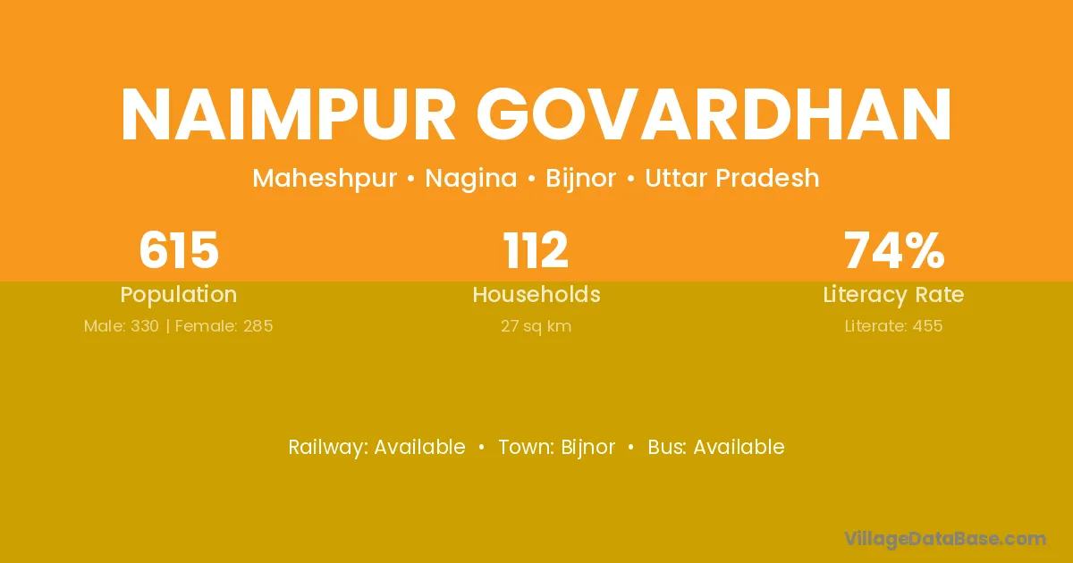 Naimpur Govardhan village has a total population of 615 people, of which 330 are males and 285 are females.