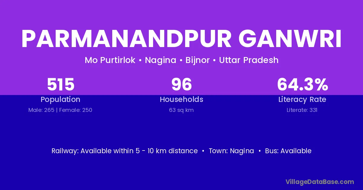 Parmanandpur Ganwri village has a total population of 515 people, of which 265 are males and 250 are females.